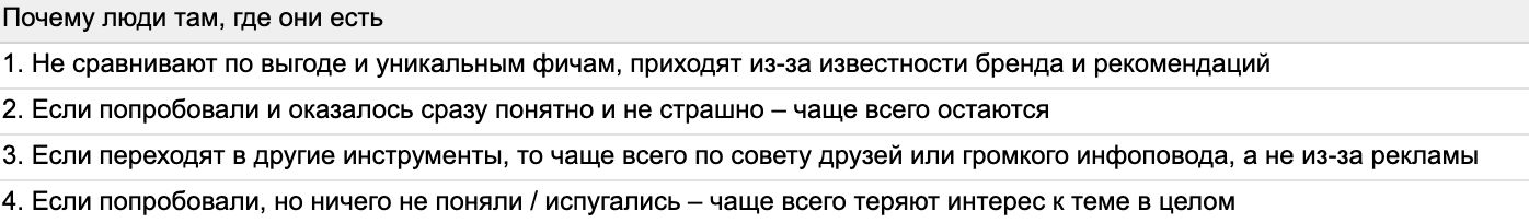 Нужно понять какими приложениями они пользуются. Также позже на интервью надобится более подробно изучить этот сегмент и тех кто сомневается, чтобы понять что для них важно и ценно и какие у них барьеры страхи и боли. Если мы снимем страхи у бытовых пользователей, продукт может подойти и сомневающимся, потому что их страхи могут быть похожи, а доверие к банку — наш козырь.