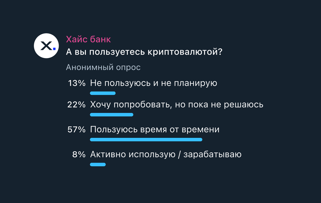Главная фишка – что кошелёк находится внутри нашего банковского приложения в виде сервиса и что все рублёвые операции идут через карту нашего банка (Хайс-карту). В первых реакциях её почти не обсуждают – люди сразу пытаются понять, насколько это будет выгодно. Похоже, с криптой часть нашей аудитории уже сталкивалась.