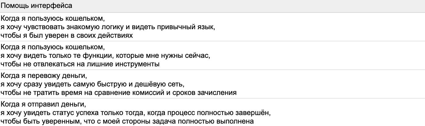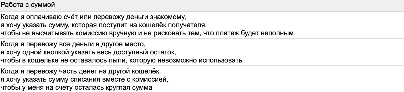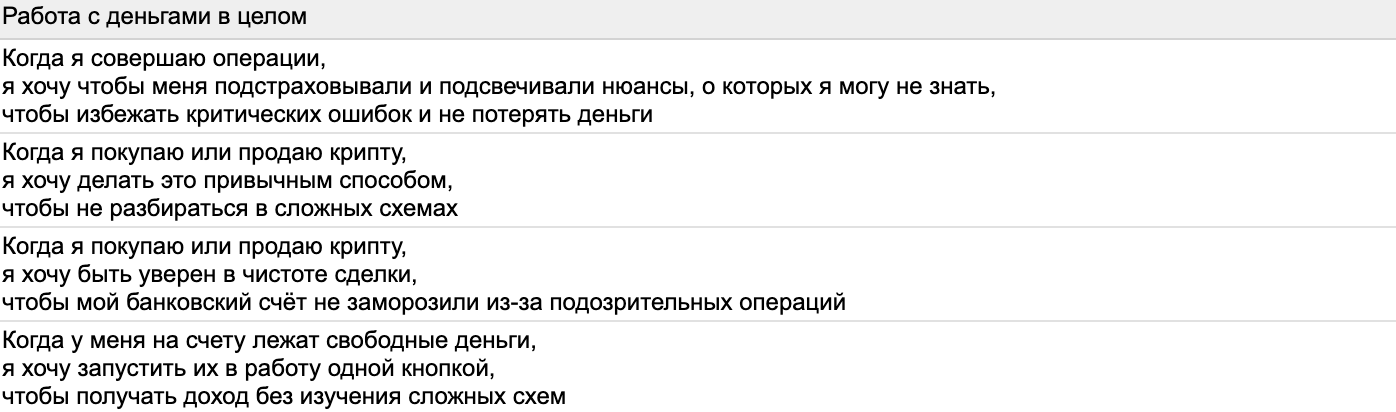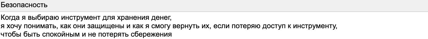 На основе Jobs Stories можно увидеть, что предпочтения и боли совсем новичков и более продвинутых новичков очень похожи. Просто они в усиленной форме и относятся к теме в целом, а не конкретным фичам. Наш кошелёк внутри банка сможет сработать на оба сегмента: